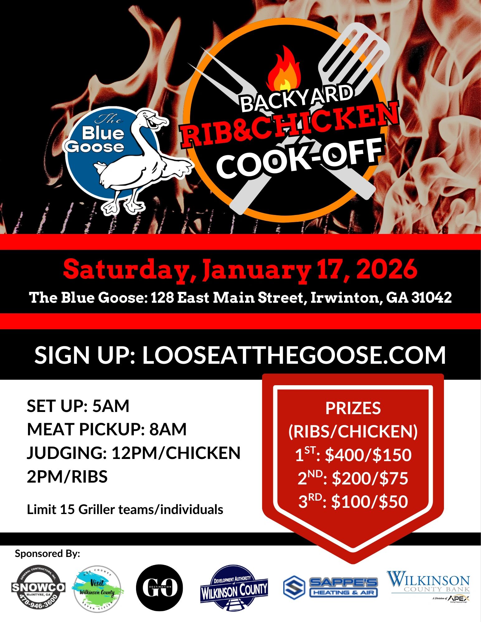 Ribs & Chicken Thighs Ready for Pick Up: 8am (2 racks of St. Louis Ribs/6 thighs)per contestant. Chicken to be presented to judges at 12. Ribs Presented for Judging: 2pm